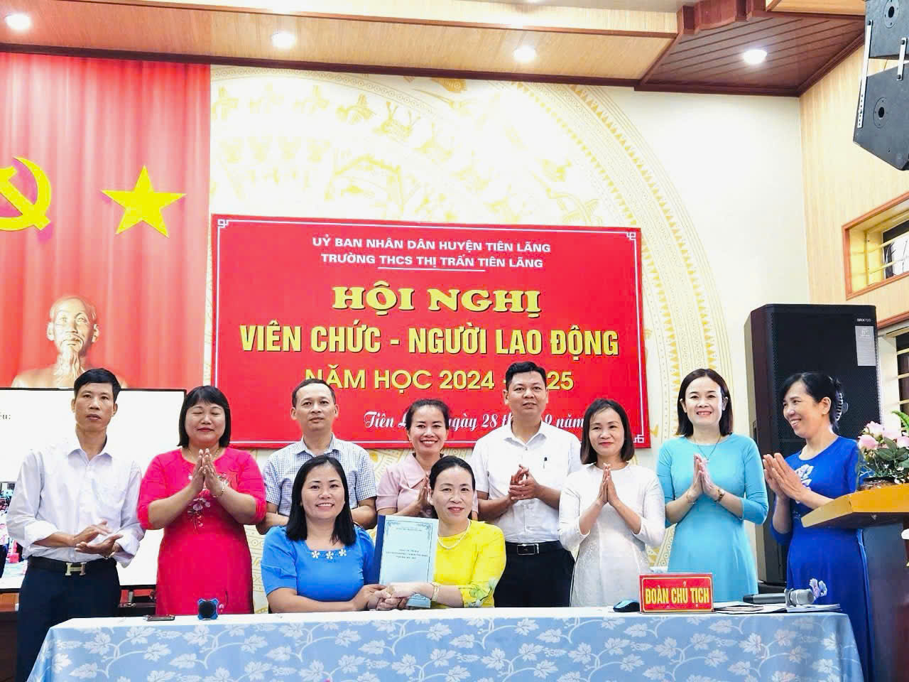 Căn cứ Hướng dẫn số 11/HD – TLĐ ngày 14 tháng 3 năm 2024 của Tổng Liên đoàn Lao động Việt Nam về việc Hướng dẫn Công đoàn tham gia thực hiện dân chủ ở cơ sở; Căn cứ Hướng dẫn số 2474/SGDĐT – TrH ngày 16 tháng 8 năm 2024 của Sở Giáo dục và Đào tạo Hải Phòng về việc hướng dẫn thực hiện nhiệm vụ Giáo dục trung học năm học 2024 – 2025; Căn cứ Kế hoạch số 31/KH – THCS ngày 4 tháng 9 năm 2024 của trường THCS thị trấn Tiên Lãng về Kế hoạch giáo dục nưm học 2024 - 2025;Căn cứ Kế hoạch tháng 9 năm 2024; Chiều ngày 28/9/2024, trường THCS Thị trấn Tiên Lãng đã tổ chức thành công HN cán bộ, viên chức- người lao động.