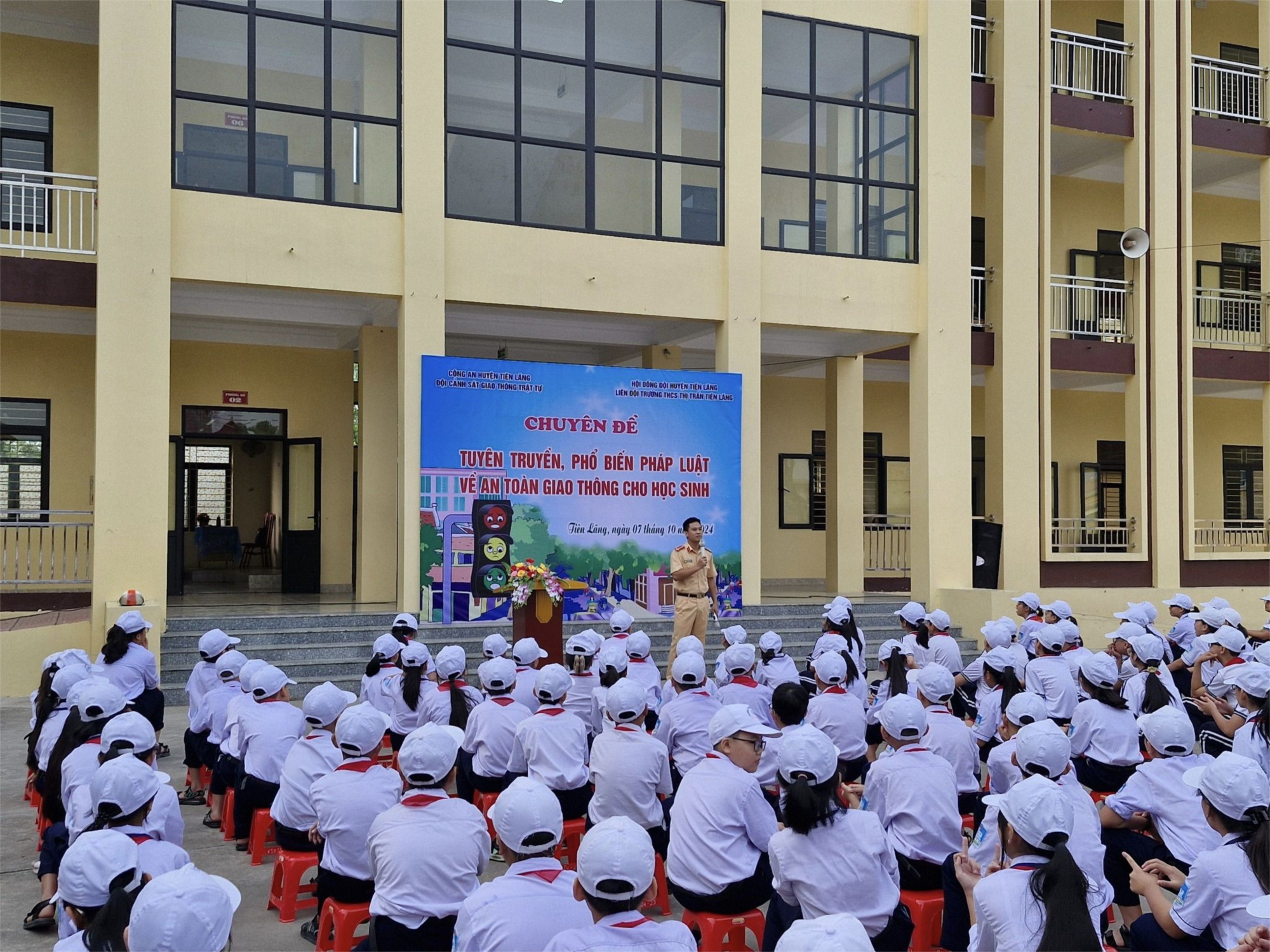 Sáng nay, Liên đội trường THCS thị trấn kết hợp với Công an huyện Tiên Lãng tổ chức Tuyên truyền, phổ biến pháp luật về An toàn giao thông cho đội viên trong toàn Liên đội.