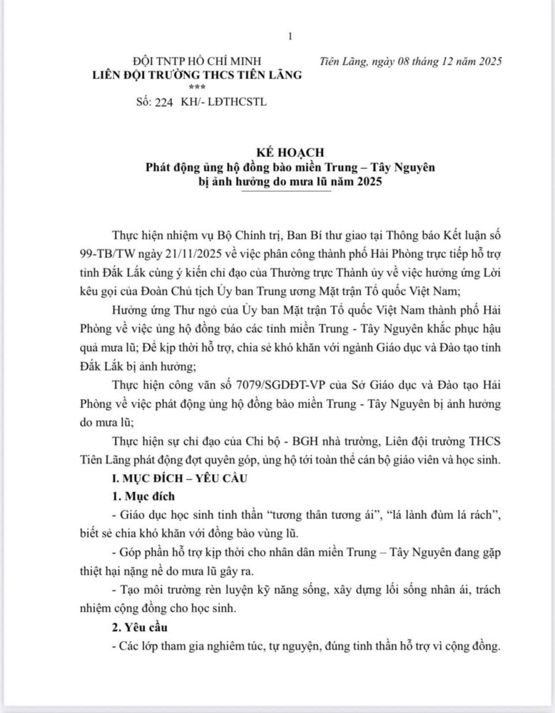 Liên đội xin kêu gọi tất cả các bạn học sinh và quý phụ huynh cùng nhau hành động, góp sức nhỏ để mang lại hơi ấm và niềm hy vọng cho đồng bào vùng lũ!